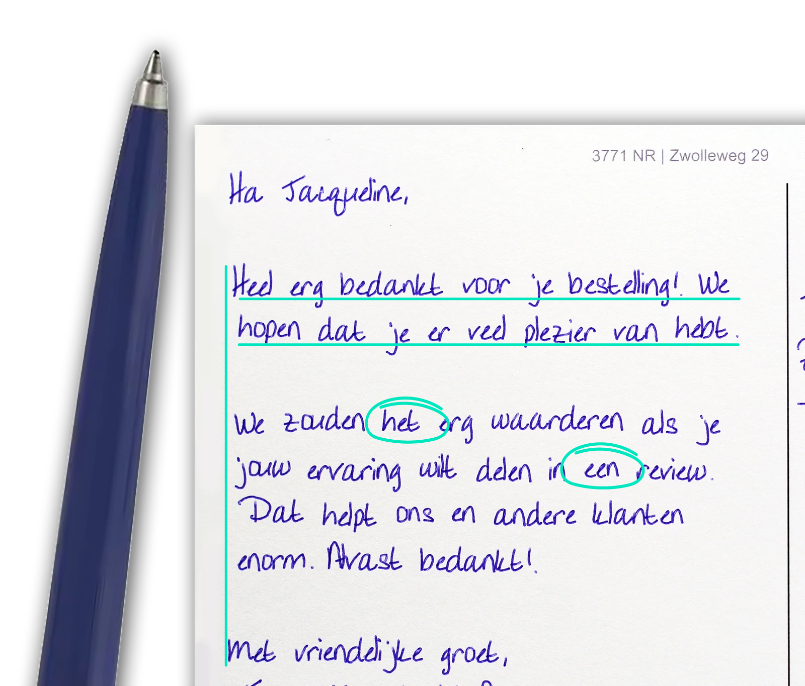 Elke kaart die we versturen is uniek: variatie in letters, druk, regels, woorden en kleine imperfecties. Precies wat ervoor zorgt dat jouw kaart wél wordt gelezen