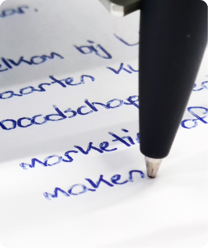 Omdat we met echte pennen schrijven, is het proces anders dan print. Kleinere aantallen worden doorgaans binnen 7 werkdagen geleverd bij je ontvanger. Voor grotere campagnes (10.000+) rekenen we gemiddeld 2–4 weken, afhankelijk van de periode. In de kerstperiode is het aan te raden vroeg te plannen.